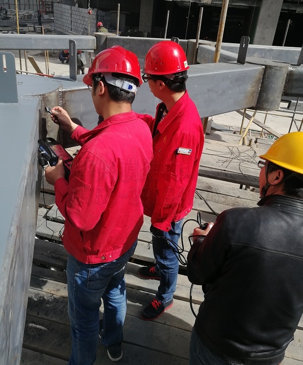 第三方檢測機(jī)構(gòu)正對已經(jīng)拼接好的鋼構(gòu)進(jìn)行探傷檢查